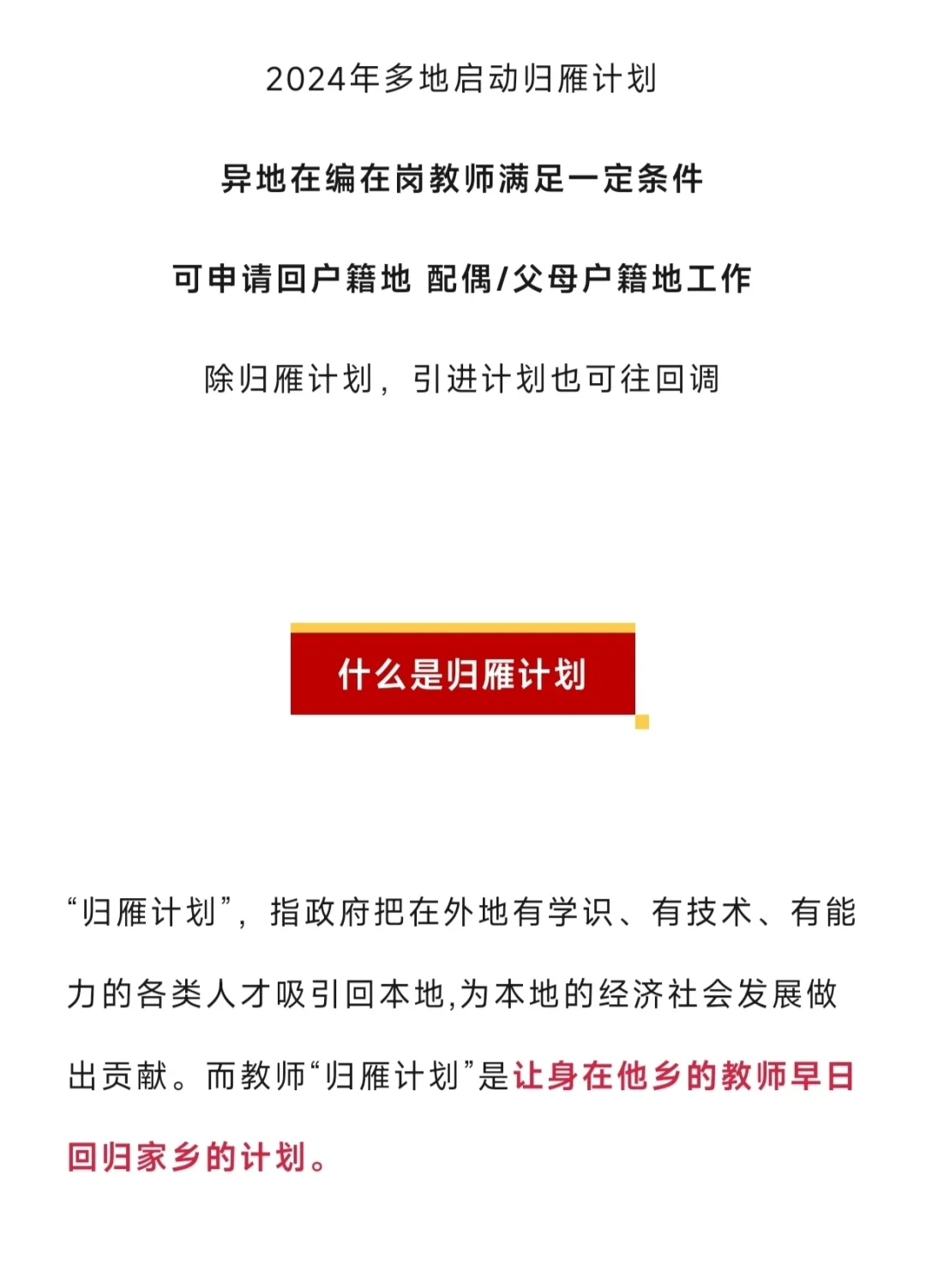 | 考编也可以异地了,归雁计划陆续启动! 归雁计划介绍\n归雁计划,顾名思义就是一个地区召回户籍地归属的老师回户籍地上班的一个政策。对于很多现在因为各种原因背井离乡,现在想回家上班的老师来说也是一个福音。\n归雁计划的面试\n归雁计划其实也算是教师招聘的一种,一般只需要笔试,或者面试。有时候可能连考试都不用参加,只需要提供相关的证件就可以。\n归雁计划的年龄和学历要求\n对于年龄要求这一块,一般都是45岁以下。专业学历的要求也跟教师资格证要求差不多,初高中需要本科学历,小学需要专科学历。\n归雁计划的招聘情况\n幼儿现在因为各地基础设施不太完善,暂时很少见到这个计划招聘。但是现在国家也在大力支持幼儿园基础建设,未来幼儿也许会出现爆发式的招聘。归雁计划的严格要求\n唯一两点比较严格的要求就是:\n一、户籍必须本人\n是当地户籍,或者你的父母配偶是当地户籍。\n第二,也是比较重要的一点,就是参加计划这个归雁计划的前提,就是你必须是在编老师。所以说,归雁计划也可以算是一种内部调控。不过现在这种政策还没有大面积普及。河南现在比较多的就是周口以及新乡地区。如果有需要的老师,一定要及时关注当地的考试信息,不要错过了。#归雁计划 #编制 #引进优秀人才 #异地教师 #备考 |