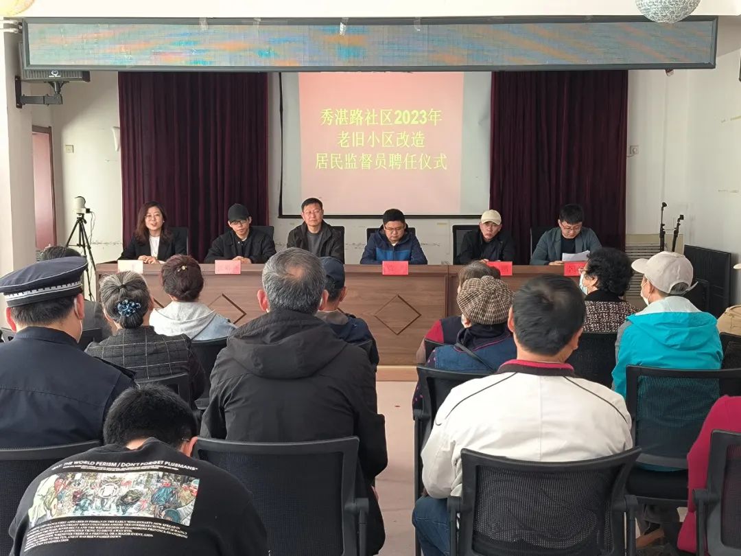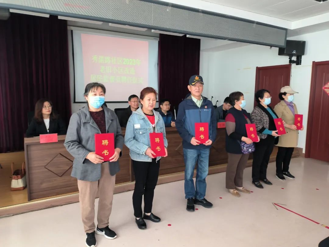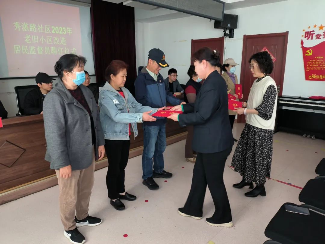 4月19日上午,湛山街道秀湛路社区举行2023年老旧小区改造居民监督员聘任仪式,街道城发办、建设单位、施工单位、监理单位、设计单位代表,以及社区居委会、网格长、网格员、居民代表参加活动。