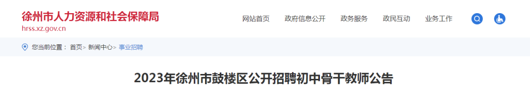 本次招聘相关岗位信息在徐州市人力资源和社会保障局网站(http://hrss.xz.gov.cn/)和徐州市鼓楼区人民政府网(http://www.xzgl.gov.cn)发布。具体招聘岗位、招聘人数、资格条件等详见《2023年徐州市鼓楼区公开招聘初中骨干教师岗位表》。