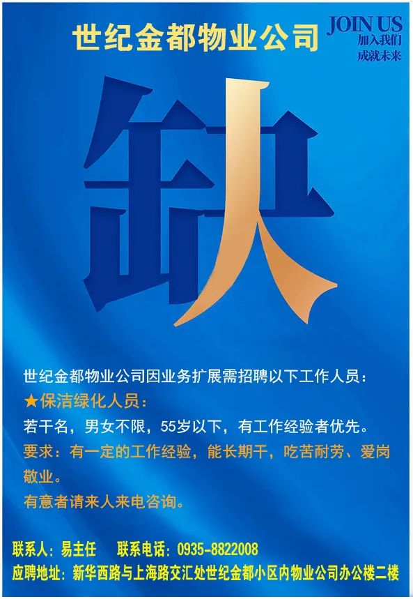 有服装销售经验、形象干净利落,认真踏实愿意学习,责任心强,20-38周岁,男女不限。【薪资待遇】:底薪2500+提成+奖金+工龄奖+每月有3天带薪假联系电话:15689748919 15095456667河北长宽服务有限公司派驻中移铁通金昌分公司招聘岗位1.集客技术经理4名,主要负责集团客户专线网络维护,要求熟悉计算机操作。2.综合维护员5名,主要负责基站、光缆线路日常维护。3.智慧家庭网络工程师10名,主要负责家庭客户宽带、智能家居产品的安装及日常维护,要求熟悉计算机操作。薪资待遇:实习期1-3个月,月薪2800元,实习期结束后根据岗位及工作能力核定绩效工资,月薪4000-10000以上。4.市场督导经理2名,具有较强的营销和沟通能力;高中及以上学历,熟悉移动业务并有营销管理工作经验者优先。月工资2500+业绩提成,购买三险。要求:年龄45岁以下,高中以上学历,身体健康,责任心强。