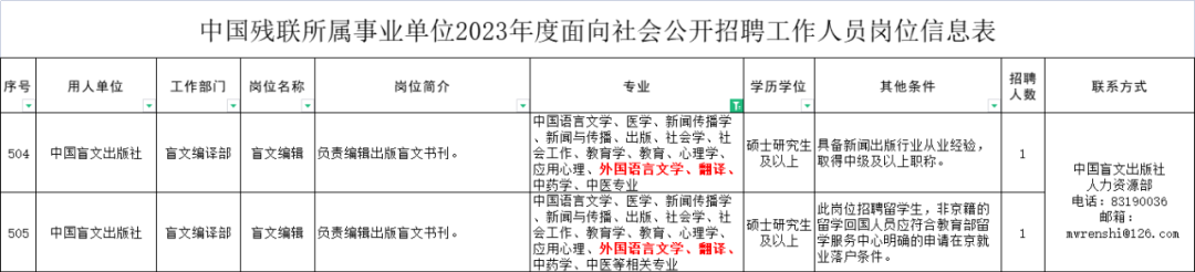 详见附件《中国残联所属事业单位2023年度面向社会公开招聘工作人员岗位信息表》。其中,中国康复研究中心眼科技师岗(序号:106)、中国盲文出版社盲文编译部盲文编辑岗(序号:505)招聘留学生,非京籍的留学回国人员应符合教育部留学服务中心明确的申请在京就业落户条件。其他岗位应聘人员应具有北京市常住户口。