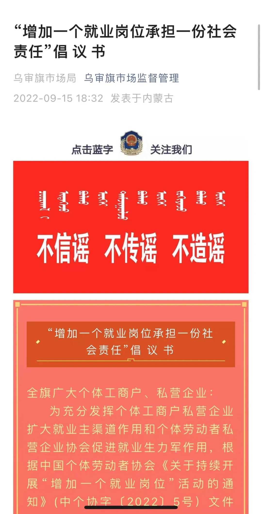 通过乌审旗市场监督管理局官方公众号,向全旗的个体工商户和私营企业发布了《“增加一个就业岗位、承担一份社会责任”倡议书》,鼓励广大个体工商户和私营企业积极提供就业岗位,为促进就业工作全面做好宣传工作。