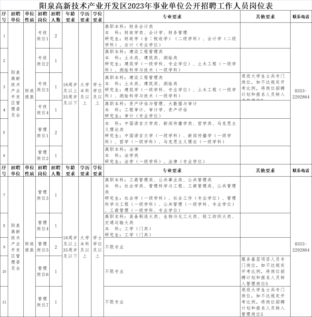 阳泉高新区技术产业开发区管理委员会根据工作需要,按照《事业单位人事管理条例》和我省《关于进一步改进和加强事业单位公开招聘工作的意见》(晋人社厅发〔2017〕35号)、《关于做好2023年全省事业单位公开招聘工作的通知》(晋人社厅发〔2023〕11号)等政策规定和要求,经研究面向社会公开招聘工作人员14名。
