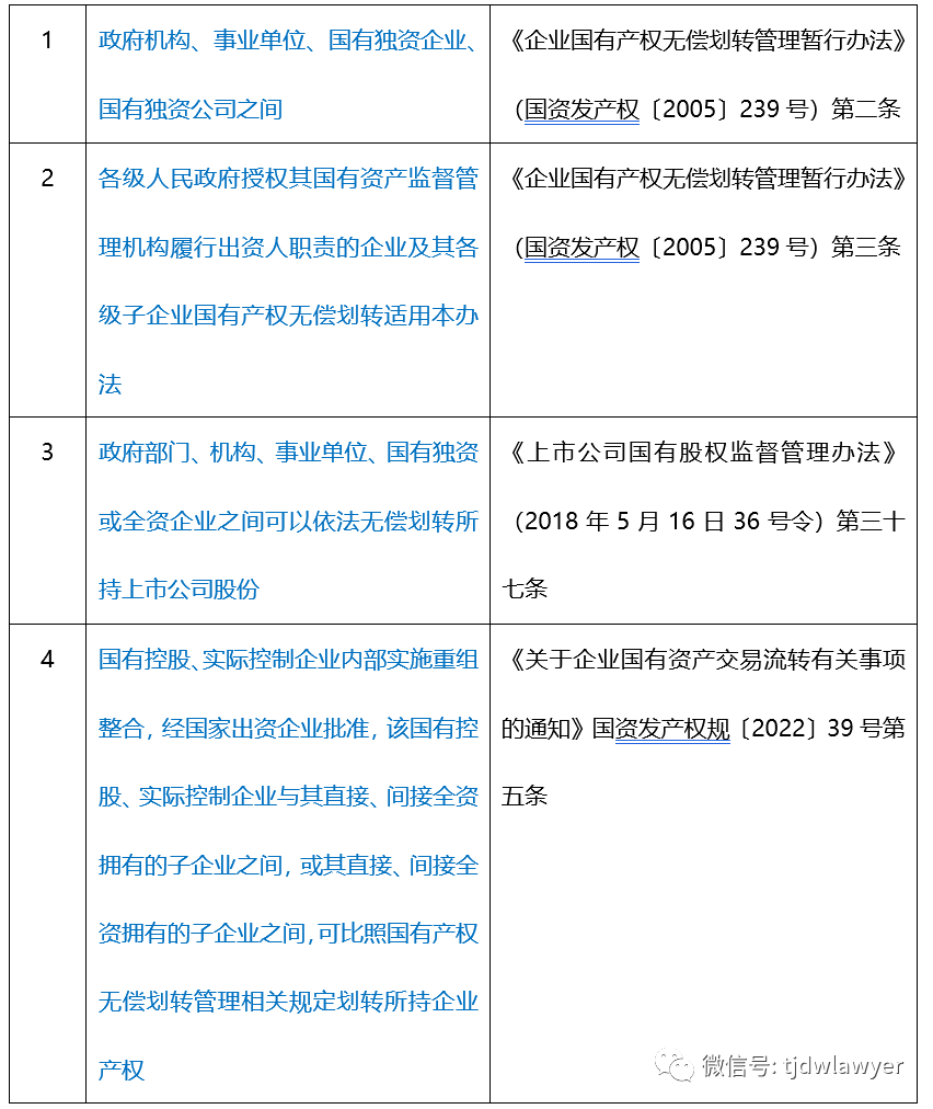 针对国有产权无偿划转的适用主体,我国法律体系以《企业国有产权无偿划转管理暂行办法》(部门规章)为核心,其他为补充,包括以下情形: