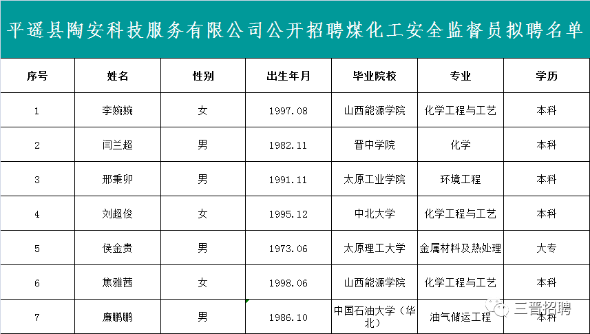 根据《平遥县陶安科技服务有限公司公开招聘煤化工安全监督员公告》规定,现将平遥县陶安科技服务有限公司2023年为平遥煤化工工业园区公开招聘煤化工工业园区专业安全管理人员,拟聘用人员名单予以公示。