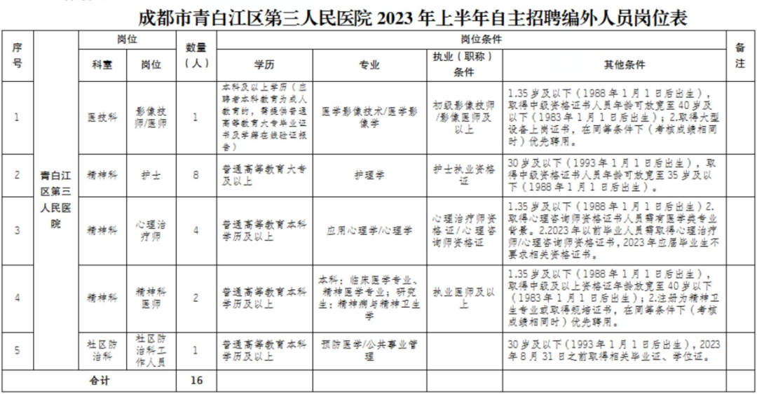(三)岗位招聘人数及招聘对象。各岗位招聘人数、具体专业、岗位及报名条件详见《成都市青白江区第三人民医院2023年上半年自主招聘编外人员岗位表》(详见附件1)