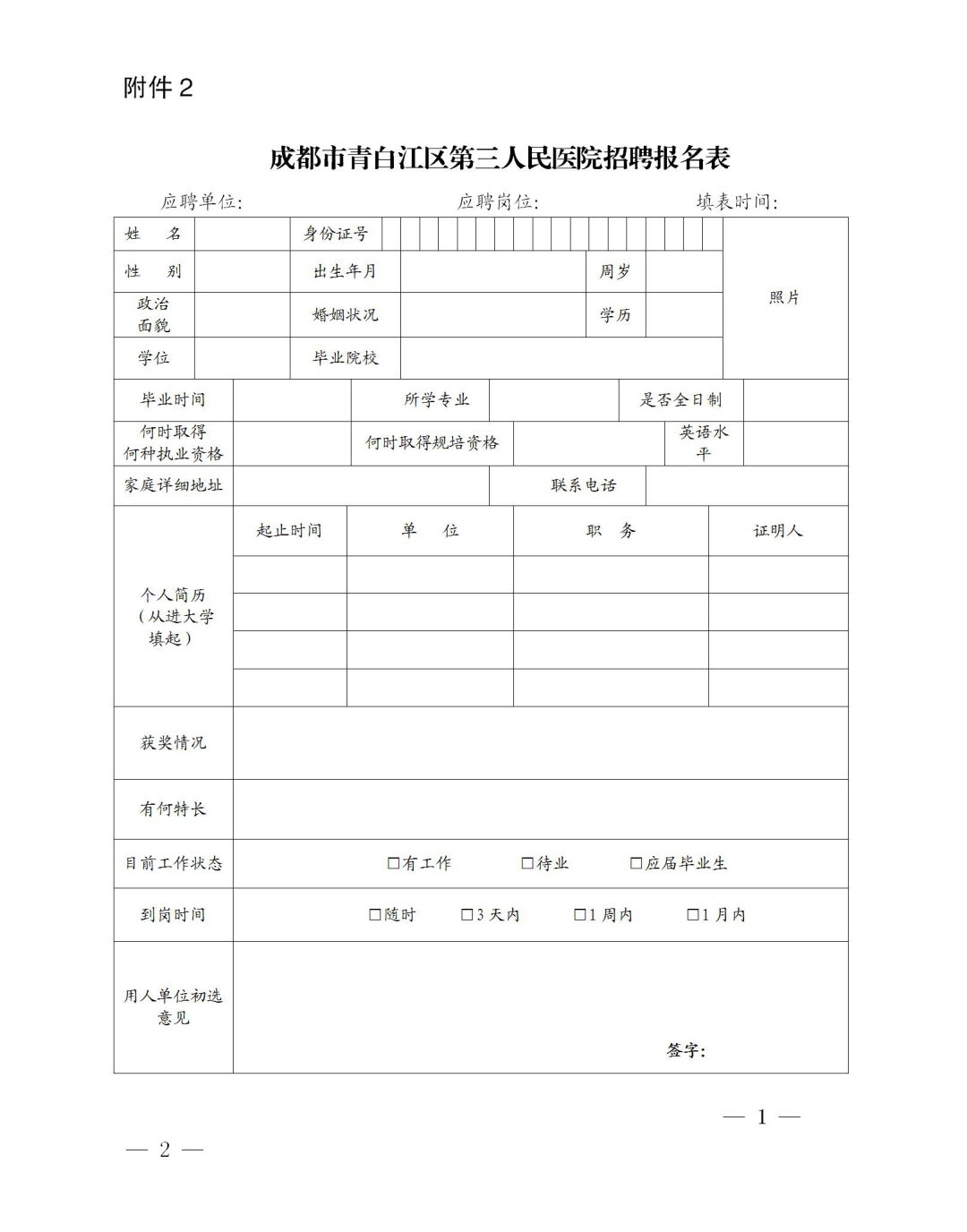 应聘人员持个人简历前往成都市青白江区第三人民医院行政区38号院办公室现场或通过电子邮箱(2498698498@qq.com)网上报名,网上报名所需资料:简历、毕业证、学籍证明、资格证书、执业证书(盖章页和信息页)、身份证(正反面)、一寸白底照片、报名表(附件2电子版),扫描打包发送。