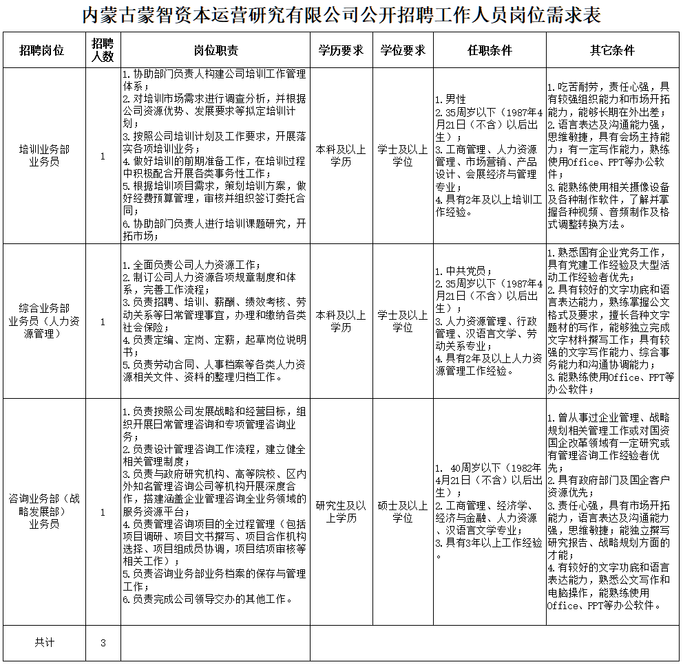 本次共招聘3人。具体计划人数及条件详见附件《内蒙古蒙智资本运营研究有限公司公开招聘工作人员岗位需求表》(以下简称“岗位需求表”)。