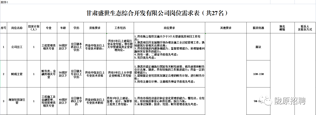 具体岗位及要求详见《甘肃盛世生态综合开发有限公司岗位需求表》(附件1)。