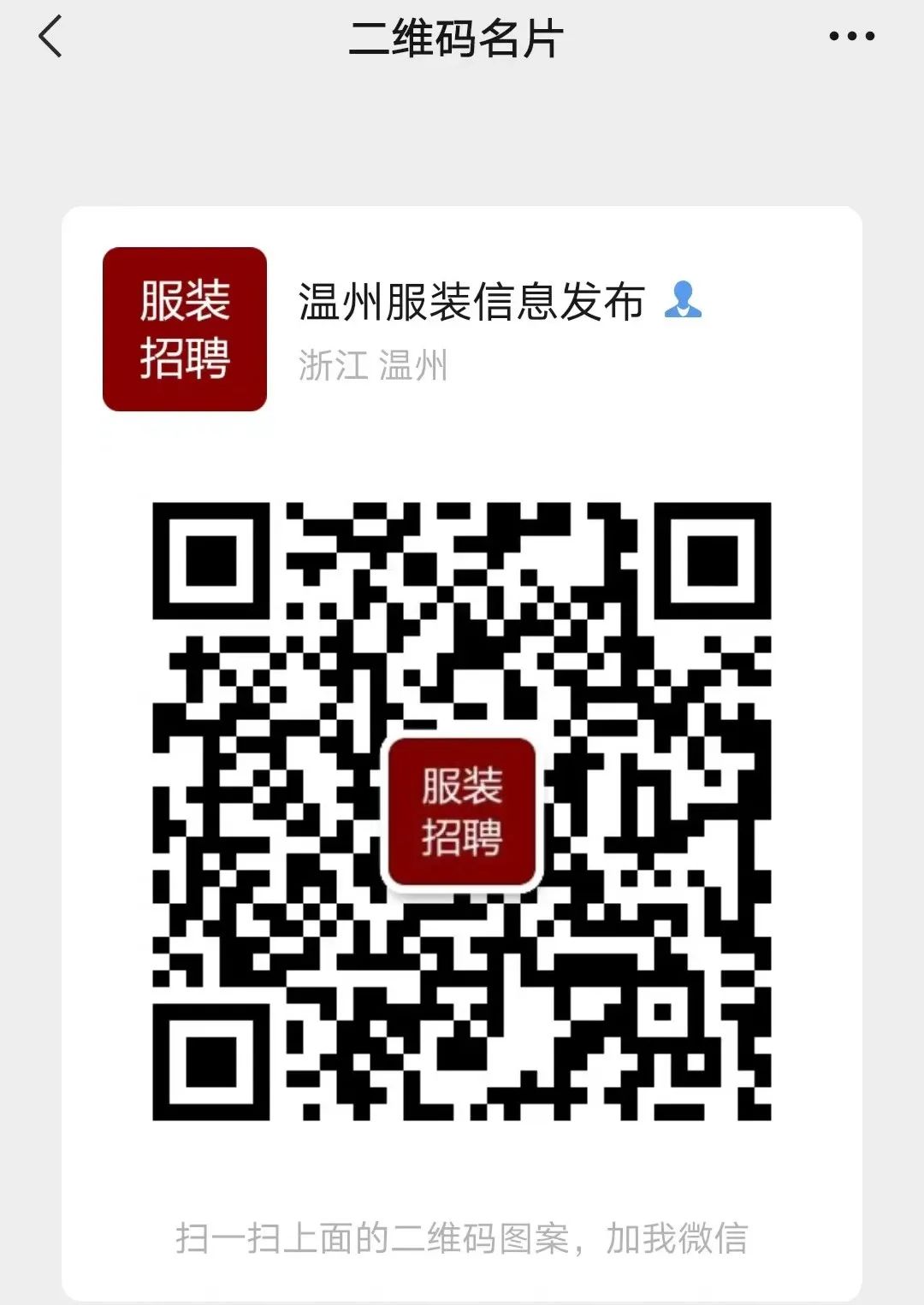 做服装的加微信 WZFZ858。可以发招聘求职信息,拉你进行业微信群,扩大人脉,朋友圈同步更新招聘求职信息,信息免费发布,我们只是发布信息,找工作要注意辨别