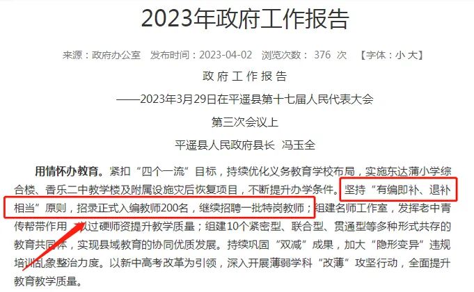 4月初左右,平遥召开人代大会,研究讨论了23年工作重点,其中关于教师招聘方向作出了明确指示:结合本月中旬山西教育厅发布《部署2023年山西招聘中小学幼儿园教师招聘工作》内容中,原则上全省招教笔试工作应于5月底前完成的通知,预计本次平遥发布公告时间大约在5月1日前后,考生可及时关注文末各公众号。笔试内容:中小学教师-公共科目笔试为本学段教育学和教育心理学,专业科目为本学科高中段知识。幼儿教师-公共科目笔试为本学段教育学和教育心理学,专业科目为《3-6岁儿童学习与发展指南》、《幼儿园教育指导纲要》、《幼儿园工作规程》、《幼儿园教师专业标准》。推荐阅读: