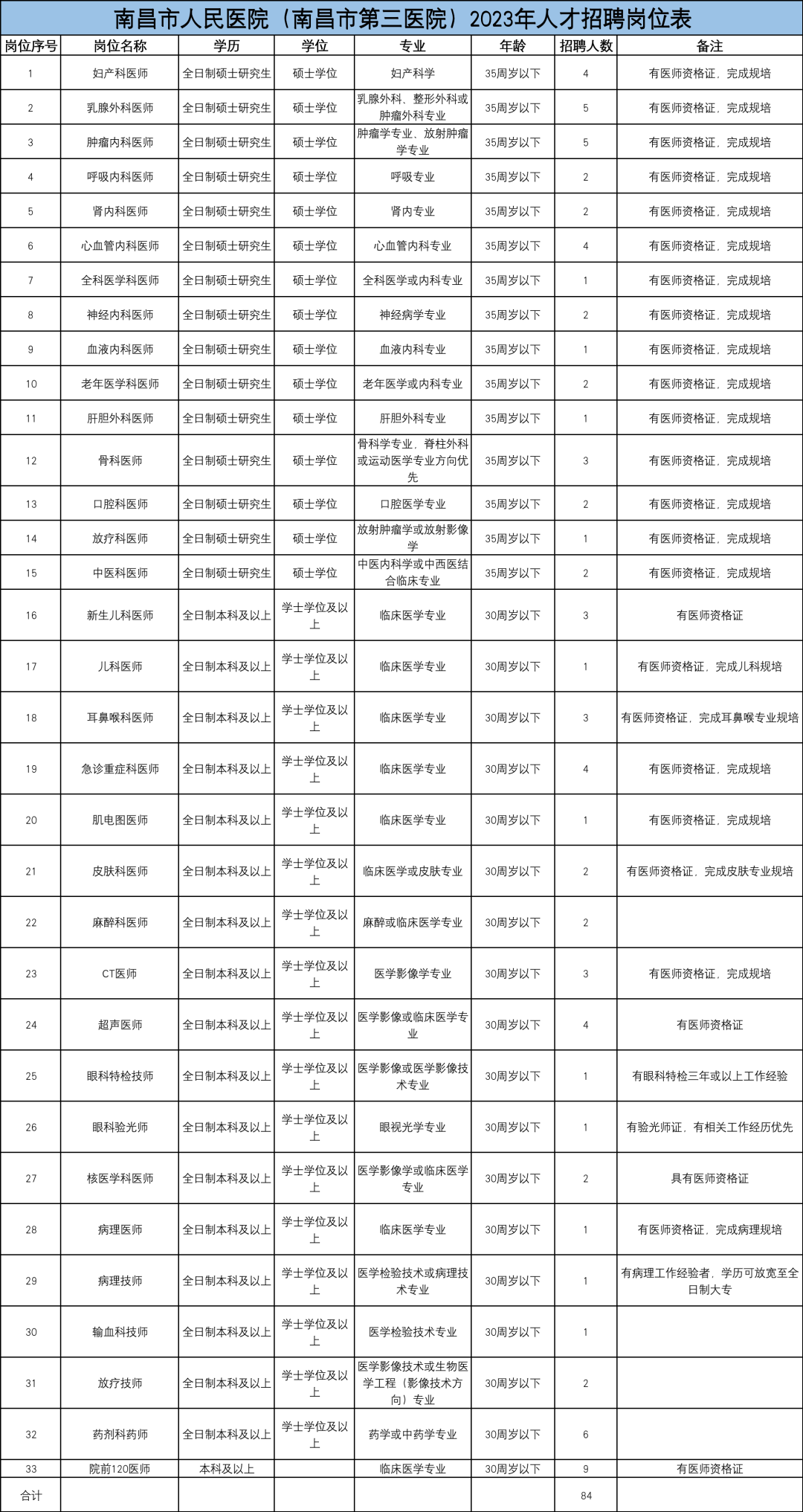 本次招聘涉及33个岗位,计划招聘84人,具体岗位及资格条件详见《南昌市人民医院(南昌市第三医院)2023年人才招聘岗位表》(附件1)。