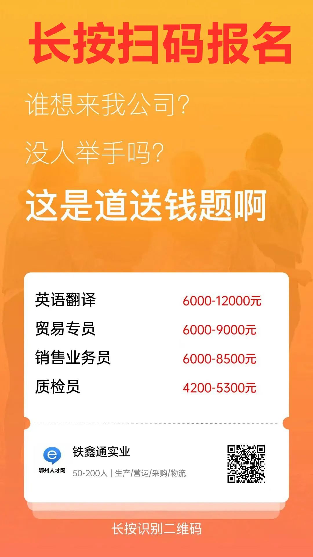 >鄂州招聘:贸易专员,质检员,业务员,英语翻译,月薪6000-12000元