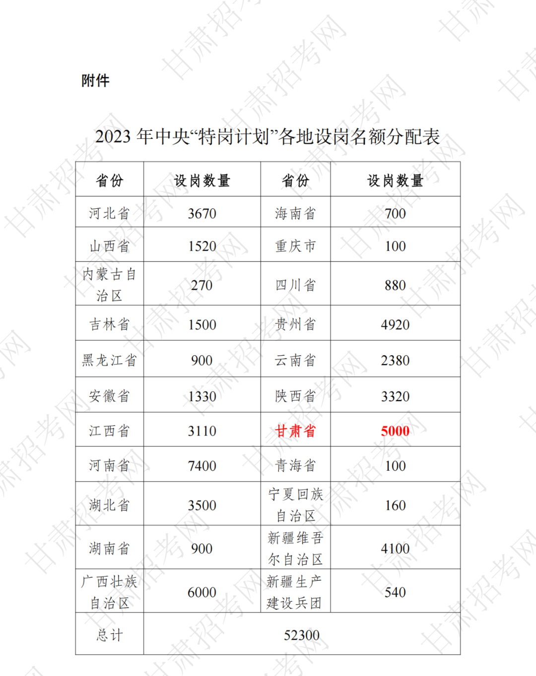 (二)招聘数量。2023年全国计划招聘中央“特岗计划”教师52300名,各省(区、市)和新疆生产建设兵团的招聘名额见2023年中央“特岗计划”各地设岗名额分配表(附件)。