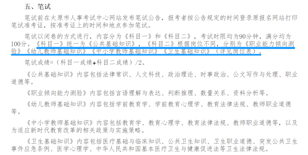 ✅笔试内容:《科目一》统一为《公共基础知识》,《科目二》根据岗位不同,分别为《职业能力倾向测验》《幼儿教师基础知识》《中小学教师基础知识》《卫生基础知识》(详见岗位表)