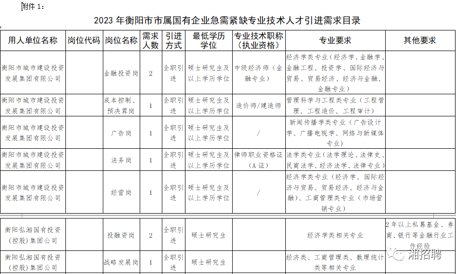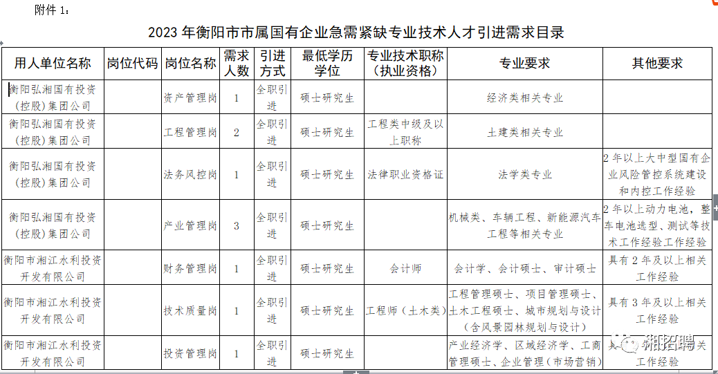 根据《衡阳市市属企事业单位人才引进实施办法》(衡人才办通〔2022〕4号)、《衡阳市关于发布2023年度高层次和急需紧缺专业技术人才引进需求目录和引才活动有关事项的公告》和衡阳市国资委《关于印发<衡阳市市属国有企业人才引进实施办法>的通知》(衡国资〔2022〕46号),经中共衡阳市委人才工作领导小组办公室同意,衡阳市国资系统3家市属国有企业决定面向社会公开引进一批急需紧缺专业技术人才。现将有关事项公告如下:坚持公开、平等、竞争、择优原则。实行岗位公开、自愿申报、择优选拔。衡阳市国资委监管3家市属国有企业计划引进19人(岗位详情见附件1),其中:衡阳市城市建设投资发展集团有限公司计划引进6人,衡阳弘湘国有投资(控股)集团有限公司计划引进10人,衡阳市湘江水利投资开发有限公司计划引进3人。