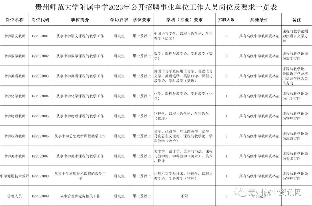 1.贵州师范大学附属中学2023年公开招聘事业单位工作人员岗位及要求一览表
