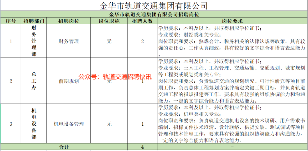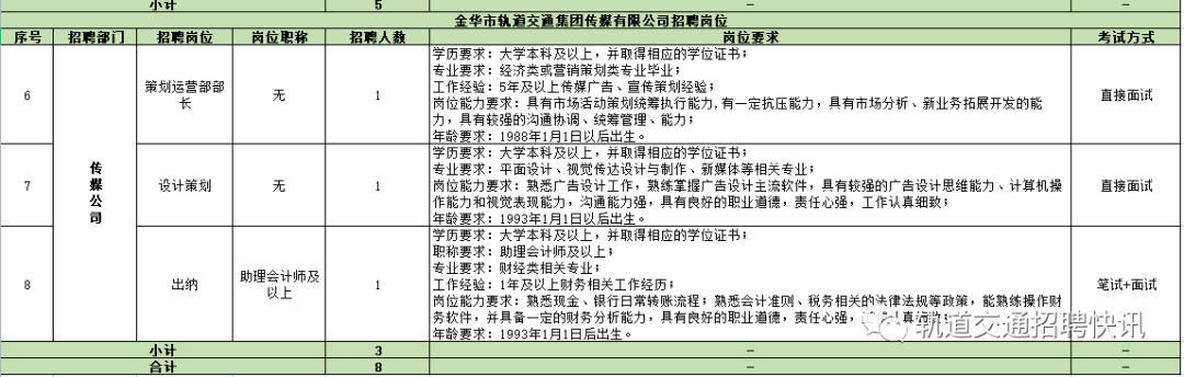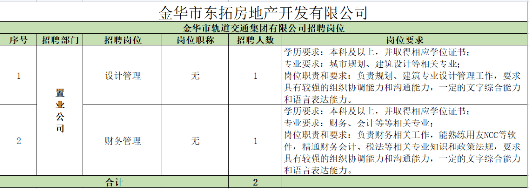 金华市东拓房地产开发有限公司(以下简称东拓公司)是金华市轨道交通集团置业有限公司的全资子公司。成立于2021年12月22日,注册资本三亿五千元。目前有悦享湖韵、文星阁等房地产项目正稳步推进。为加快推进市轨道交通集团及下属子公司经营发展需要,经公司研究决定,现公开招聘一批工作人员。1.市轨道交通集团招聘各岗位人数合计5人:其中财务管理部副部长1人、信息管理1人、法务1人、招标管理1人、设备弱电系统管理1人;2.传媒公司招聘各岗位人数合计3人:其中策划运营部部长1人、设计策划1人、出纳1人(具体岗位明细见附件1)。