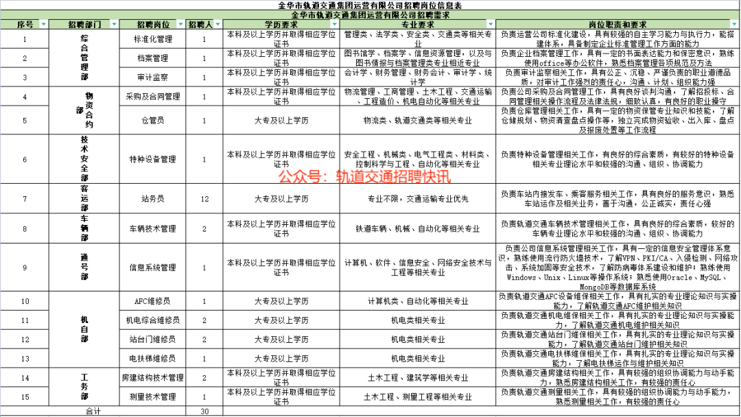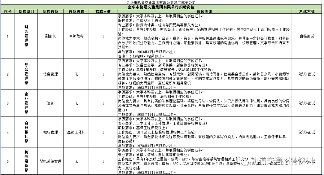(1)公司官网:http://www.jhmtr.net/(2)咨询邮箱:jhgdjthr@jhmtr.net(3)联系电话:集团公司:0579-86080207(厉先生)集团公司:浙江省金华市金东区金义东公路88号(李渔东路与二环东路交叉口)。运营公司:浙江省金华市金东区塘雅镇新店村金华市轨道交通运营有限公司塘雅车辆段综合楼1107办公室。应聘人员提交身份证原件复印件、经学校盖章的毕业生就业推荐书原件、在校成绩单、学籍在线验证报告等相关证明材料进行资格初审。报名人员通过微信公众号填写报名信息并上传证明材料由工作人员进行资格初审。对符合条件的报名人员安排面试,报名人员面试时间、地点另行通知。对通过面试的拟录用人员进行考察。考察出现不合格者,可按面试成绩从高分到低分依次进行递补。若确无合适人选,岗位可空缺。面试通过人员进入体检环节,拟录用人员按我司要求,到所在城市三级以上医院自行体检。标准参照《公务员录用体检通用标准(试行)》执行,体检不合格者,取消录用资格;体检合格者予以录用。(体检结果有疑异的以招聘单位认定意见为准)体检合格后签订三方就业协议,录用人员按我司规定的时间报到,并办理入职手续。逾期未报道者,视作放弃入职资格。为确保招聘质量,经研究确无合适人选的职位可以空缺。对招聘人员实行试用期,试用期满后,经考核胜任试聘岗位的将正式聘用;不胜任试聘岗位的将予以解聘。聘用对象享受国家和地方政府规定的各项社会基本保险和福利(五险一金),执行公司薪酬及福利制度。本次招聘工作由金华市轨道交通集团有限公司纪委(监督电话:0579-86080208)、金华市国资委负责监督(监督电话:0579-83187893)。本公告未尽事宜由招聘领导小组办公室解释。附件1:金华市轨道交通集团有限公司2023届应届毕业生招聘岗位信息表.xlsx附件2:金华市轨道交通集团运营有限公司2023届应届毕业生招聘岗位信息表.xlsx附件3:金华市东拓房地产开发有限公司2023届应届毕业生项目制周期性用工工作人员招聘岗位信息表.xlsx 好文推荐:戳标题即可查看
