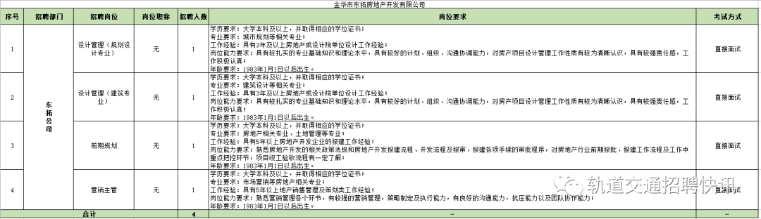 东拓公司招聘各岗位人数合计4人:设计管理(规划设计专业)1人、设计管理(建筑专业)1人、前期规划1人、营销主管1人(具体岗位明细见附件2)。项目制用工:项目制用工劳动合同期限以完成项目任务为期限,项目任务完毕,劳动合同即终止。