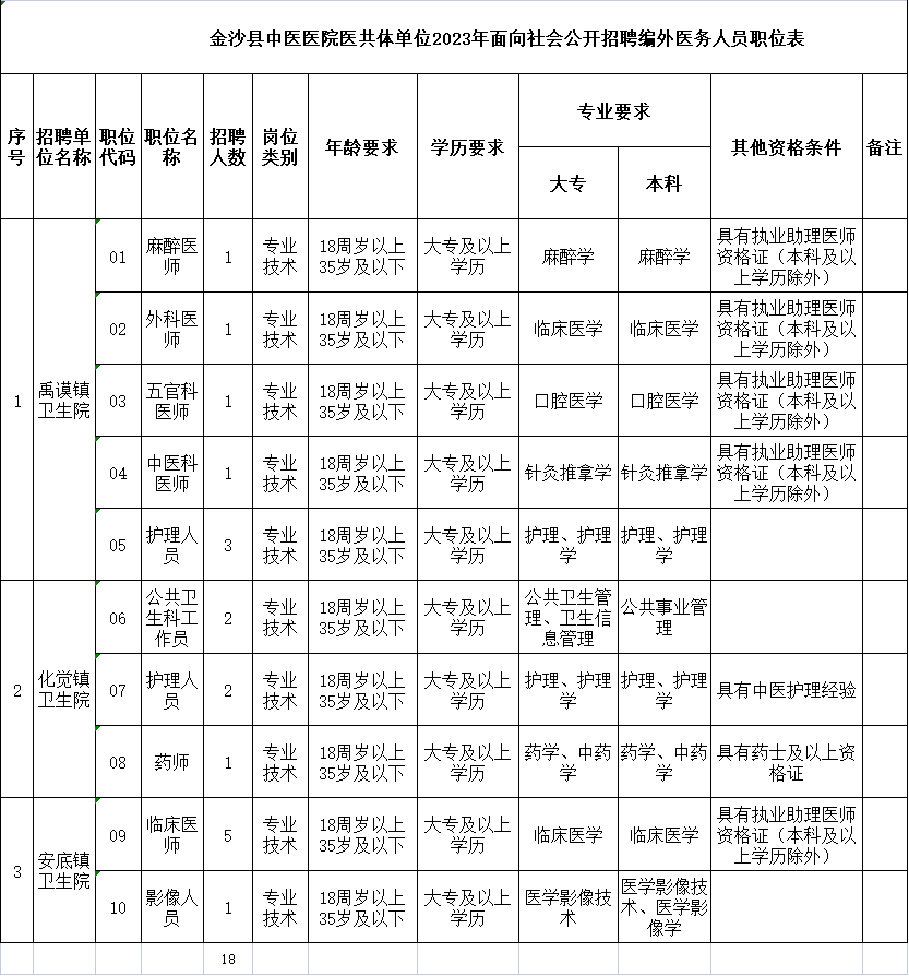 具体岗位详见《金沙县中医医院医共体单位2023年面向社会公开招聘编外医务人员职位表》(以下简称《职位表》,附件1)。