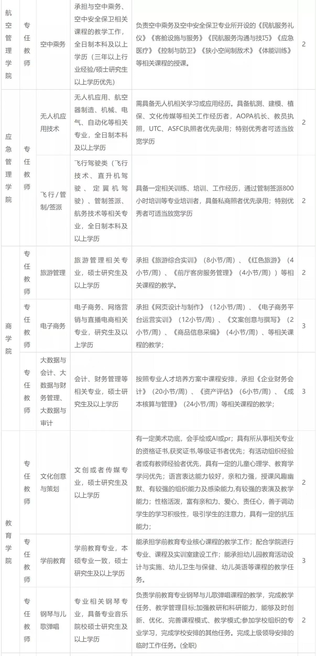 学校特聘具有丰富教学经历的副高以上职称,包括航空飞行类、机械工程类、电工电子类、经贸类、汽车工程类、公共管理类、部分基础类专业,特别优秀专业人员可低职高聘。要求年龄65周岁以下,身体健康。