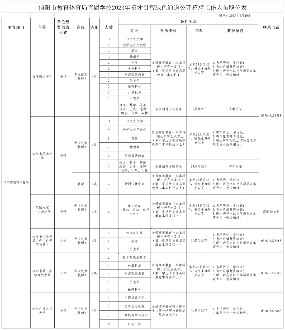 附件:信阳市教育体育局直属学校2023年招才引智绿色通道公开招聘工作人员职位表