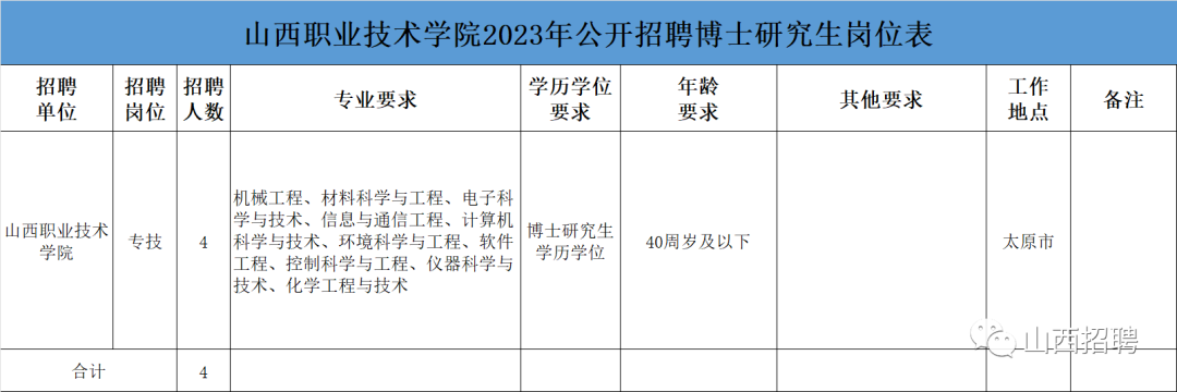 山西职业技术学院2023年公开招聘4名博士研究生,均为专业技术岗位。招聘岗位所需的具体条件以《山西职业技术学院2023年公开招聘博士研究生岗位表》(附件1)的要求为准。