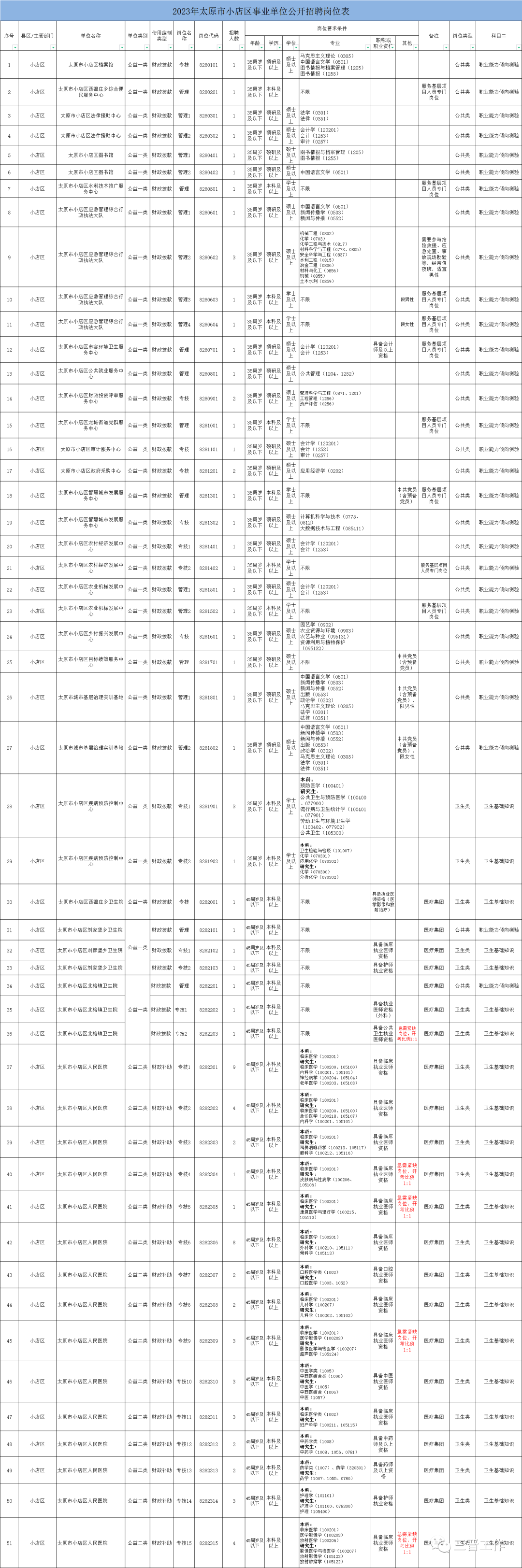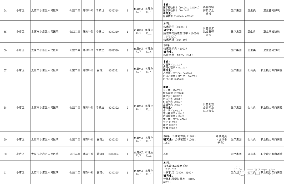 五、招聘程序 本次公开招聘按照发布公告、报名和资格审查、考试和资格复审、体检考察、公示、聘用等程序进行。 (一)发布公告 本次公开招聘信息通过下列网站发布: 山西省人力资源和社会保障厅官网(http://rst.shanxi.gov.cn/) 太原市人力资源和社会保障局官网(http://rsj.taiyuan.gov.cn/) 太原市人事考试中心网站(http://rsks.rsj.taiyuan.gov.cn/) 小店区人民政府网站(https://www.tyxd.gov.cn/) (二)报名和资格审查 本次公开招聘笔试工作委托太原市人事考试中心统一组织。报名、资格初审等具体事宜详见2023年太原市事业单位公开招聘工作人员报名和笔试公告。 (三)考试和资格复审 考试采取笔试和面试相结合的方式。 笔试以闭卷的方式进行,内容分为《科目一》和《科目二》,考试时限均为90分钟,满分均为100分。《科目一》统一为《公共基础知识》,《科目二》根据岗位不同,分别为《职业能力倾向测验》《卫生基础知识》(详见《岗位表》)。 笔试成绩=(科目一成绩+科目二成绩)/2。 面试方式为结构化面试,综合成绩=笔试成绩×60%+面试成绩×40%。 综合成绩最低合格线为60分,面试未形成竞争的岗位,综合成绩最低合格线为65分。 若2名以上报考者综合成绩相同时,按笔试成绩由高分到低分的顺序排序;如笔试成绩仍相同,按科目一成绩排序;如科目一成绩仍相同,则加试一场面试,按加试成绩排序。 1.笔试 详见2023年太原市事业单位公开招聘工作人员报名和笔试公告。 2.资格复审 资格复审由太原市小店区2023年事业单位公开招聘工作人员领导组负责。 各岗位根据笔试成绩从高分到低分的顺序,按3﹕1的比例确定进入资格复审人选,人数未达3﹕1的按实有人数确定。如进入资格复审最后一名笔试成绩并列,并列人员全部进入资格复审。 资格复审前发布资格复审公告,进入资格复审人员名单、资格复审时间地点见资格复审公告。 进入资格复审人员须由本人在规定时间地点进行资格复审,未按规定时间地点参加资格复审的,视为自动放弃。 若进入资格复审人员确认放弃资格复审或资格复审不合格,从报考同一岗位人员中根据笔试成绩从高分到低分的顺序依次递补。递补只进行一次,递补后仍不足3:1的按实有人数确定。 参加资格复审人员需提供以下材料: (1)本人有效居民身份证(含港澳居民,台湾同胞需提供台湾居民往来大陆通行证或台湾居民居住证)。 (2)笔试准考证。 (3)境内高校毕业生提供毕业证及有效期内的《教育部学历证书电子注册备案表》;岗位有学位要求的,需提供报名所用学历对应的学位证和《中国高等教育学位在线验证报告》。2023年应届毕业生尚未取得毕业证、学位证的,提供毕业院校出具的学历学位、所学专业及毕业时间的证明和《教育部学籍在线验证报告》。 留学回国人员提供教育部留学服务中心出具的《国(境)外学历学位认证书》。 技工院校毕业生提供毕业证和相应职业(工种)的预备技师(技师、高级工)资格证。 (4)岗位有“中共党员(含预备党员)”要求的,需提供所在党支部或上级党组织出具的党组织关系证明,证明中须注明入党时间。 (5)岗位有职称或从业(职业、执业)资格、工作经历等其他要求的,需提供相关证件(证明)。 (6)已就业的须出具所在单位同意报考证明,其中机关事业单位在编人员还需出具所在单位具有人事管理职能的主管部门同意报考意见。 (7)大学生村官等服务基层项目人员报考“服务基层项目人员专门岗位”的,需下载打印《服务基层项目人员审核表》,由服务单位所在地县级责任部门和市以上派出主管部门审核确认,其中,“大学生村官”由市、县两级组织部门审核盖章;“特岗教师”由省教育厅审核盖章;2010年及以后“三支一扶”人员未取得服务证书的由省人社厅审核盖章,已取得服务证书的提供服务证书;“西部计划”(含晋西北计划)和2010年前“三支一扶”人员由团省委审核盖章;“农业技术推广服务特设岗位计划”人员由市、县两级农业农村部门审核盖章。 退役军人报考“服务基层项目人员专门岗位”需提供户口簿、退伍证和县级退役军人事务部门出具的相关证明。 省政府购买基层公共服务岗位人员报考“服务基层项目人员专门岗位”的,需提供与山西省创业就业促进会签订的劳动合同、《政府购买基层公共服务岗位终止劳动合同证明书》和《山西省政府购买基层公共服务岗位人员考核合格证书》。 (8)研究生按一级学科发放毕业证,通过所学专业(研究方向)报考专业要求为二级学科岗位的,还需提供毕业院校出具的所学专业(研究方向)证明及在校成绩单。 以上材料属证件类的验原件留复印件,属证明类的留原件。 证件(证明)不全或所提供的证件(证明)与报考岗位要求的资格条件不符以及主要信息不实的,资格复审不合格。 资格审查贯穿公开招聘全过程。在招聘各环节发现报考者不符合报考岗位资格条件的,立即取消报考或聘用资格。 3.面试 面试由太原市小店区2023年事业单位公开招聘工作人员领导组组织实施。 面试前发布面试公告,面试时间、地点见面试公告。 面试采取结构化面试方式进行。 面试过程全程录像,面试成绩当天公布。面试满分100分,最低合格线为60分,不合格者不得进入体检考察。 (四)体检考察 体检考察由太原市小店区2023年事业单位公开招聘工作人员领导组组织实施。 各岗位根据综合成绩