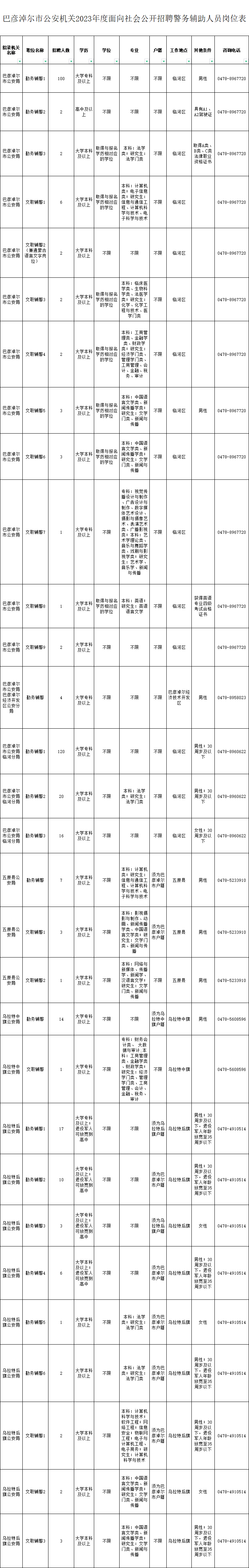 招聘岗位及资格条件、咨询电话见《巴彦淖尔市公安机关2023年度面向社会公开招聘警务辅助人员岗位表》。