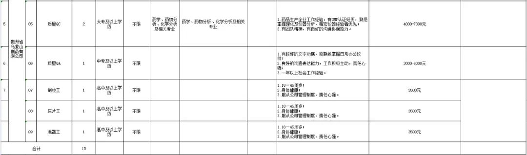 本次计划招聘劳务派遣员工10名,具体岗位要求详见《毕节市人力资源开发有限责任公司面向社会公开招聘10名劳务派遣员工派遣到贵州乌蒙山生物医药产业有限公司及下属子公司职位表》(以下简称《职位表》,详见附件1)。