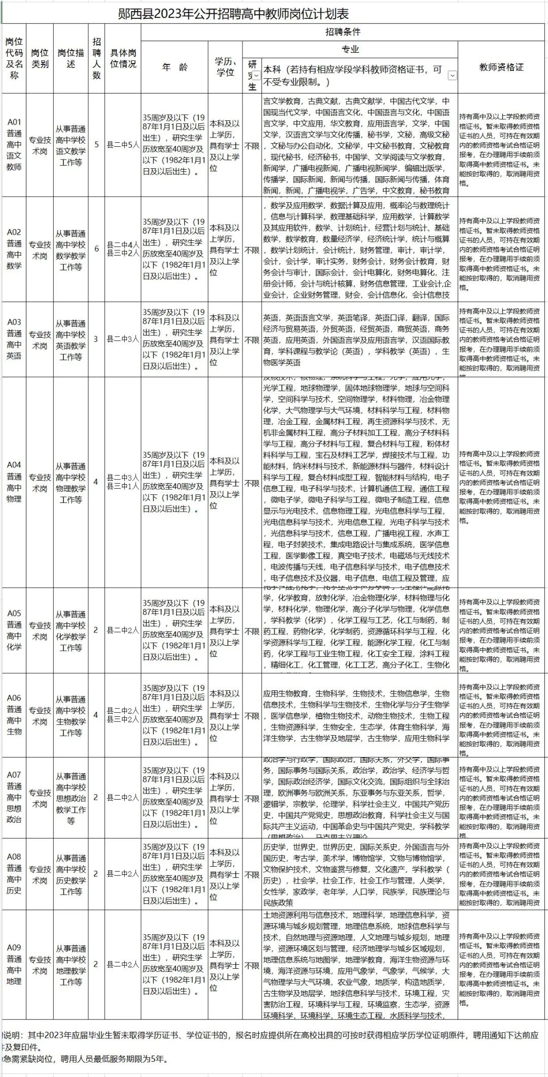 详见《郧西县2023年公开招聘高中教师岗位计划表》(附件1)。