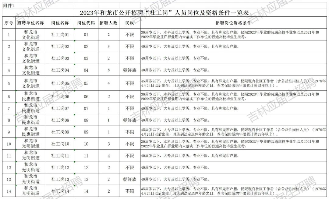 附件:1.2023年和龙市公开招聘“社工岗”人员岗位及资格条件一览表