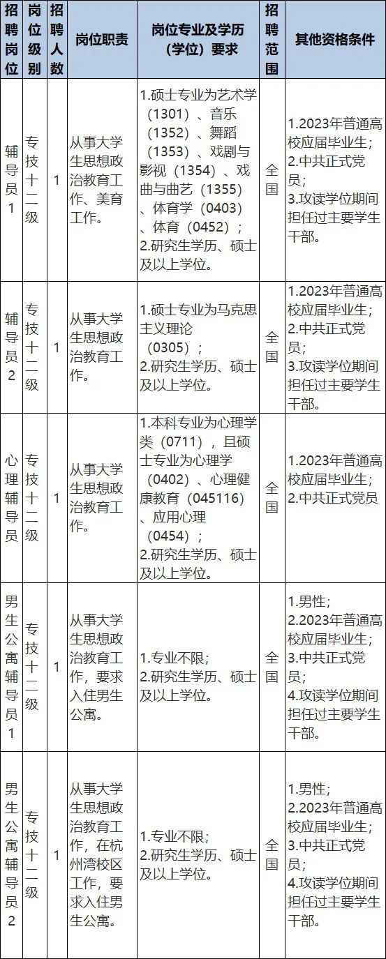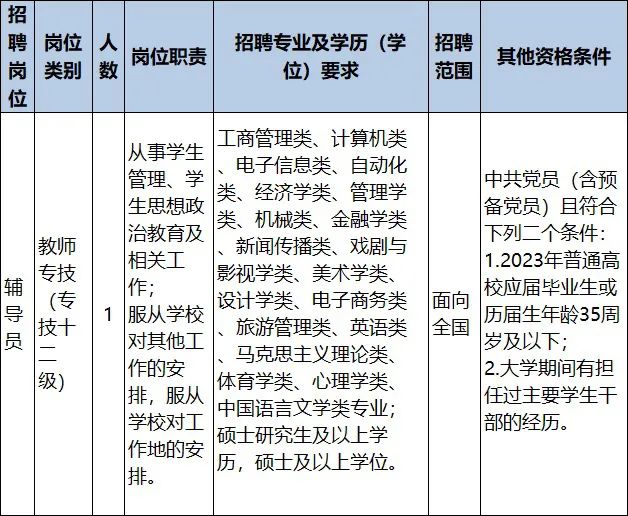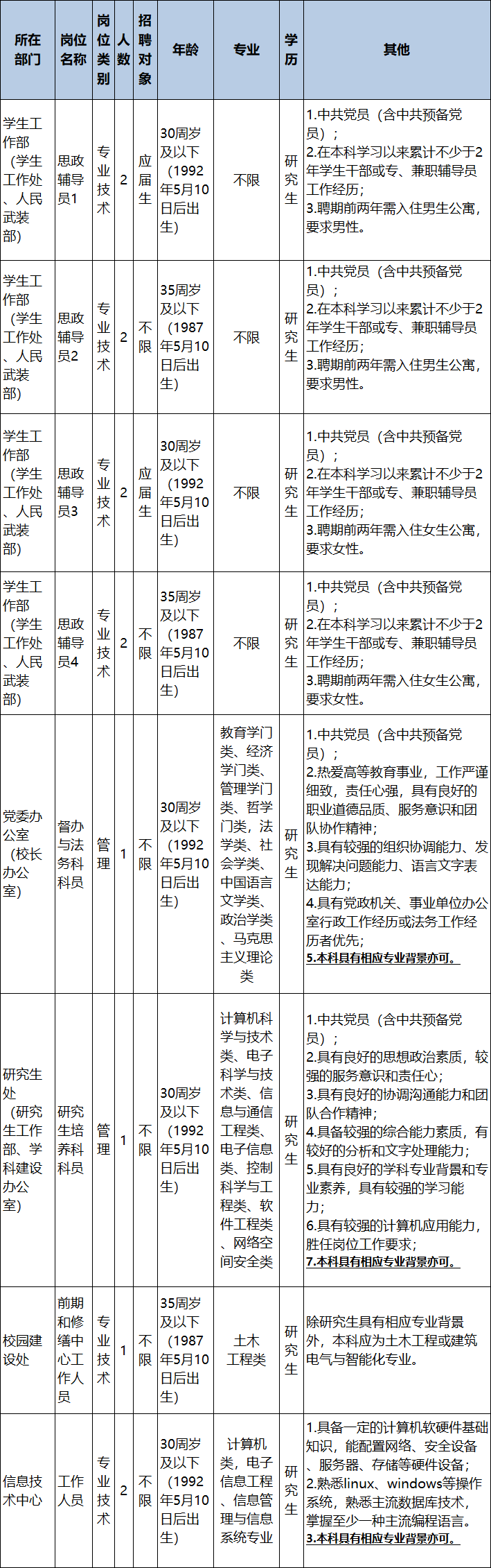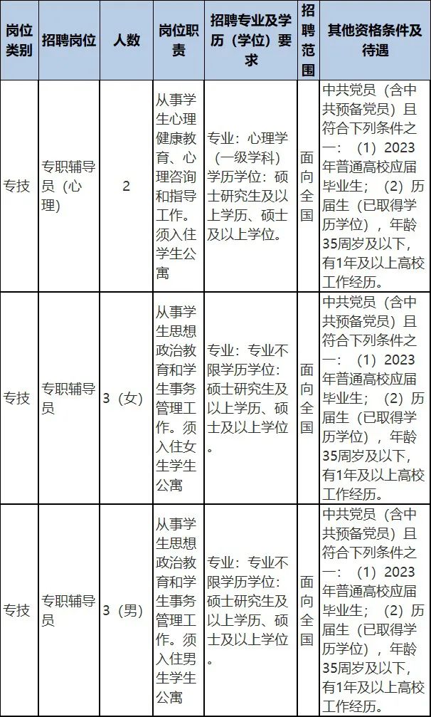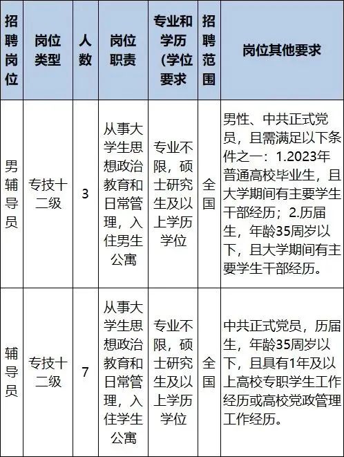本次公开招聘8个岗位共13人。其中辅导员岗位因工作期间入住学生公寓和管理服务便利需要,根据性别按一定比例分别招聘。