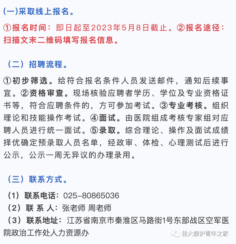 (四)纪律与监督。本次人才招聘工作严格执行“公开、平等、竞争、择优”原则,接收纪检监察部门和社会监督。招聘结果进行公示,公示期7天。医院纪委联系人:汤干事,联系电话:025-80865030。