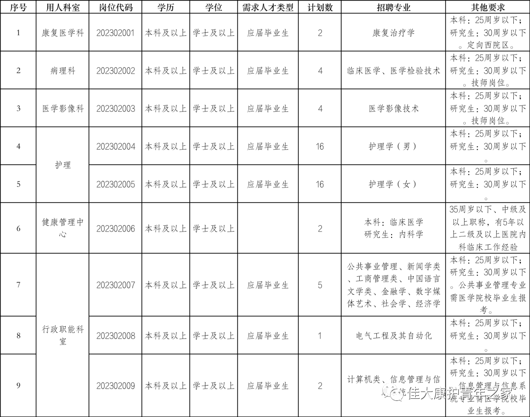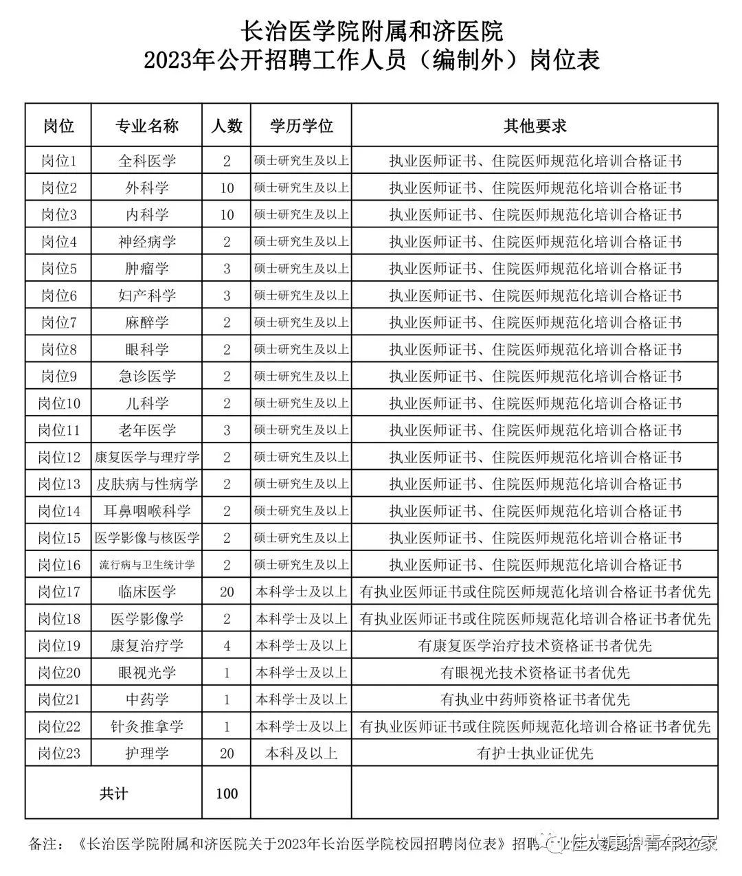 2023年我院拟公开招聘工作人员100名,具体岗位和相关要求见《长治医学院附属和济医院2023年公开招聘工作人员(编制外)岗位表》(附件1)。