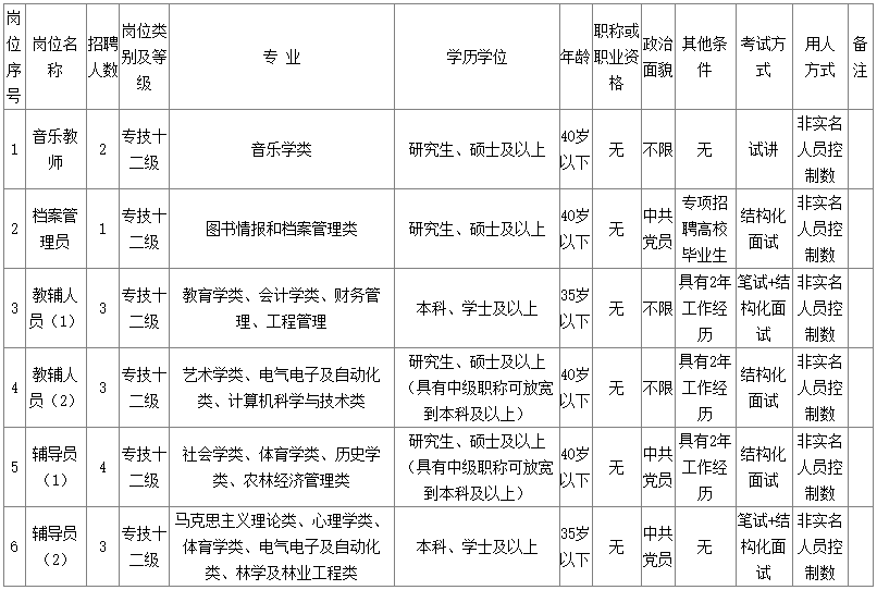 本次公开招聘非实名人员控制数工作人员16名,其中专任教师2人,行政教辅人员14人;具体招聘岗位及要求详见《广西幼儿师范高等专科学校2023年公开招聘非实名人员控制数工作人员(第一批次)岗位信息表》(附件)。