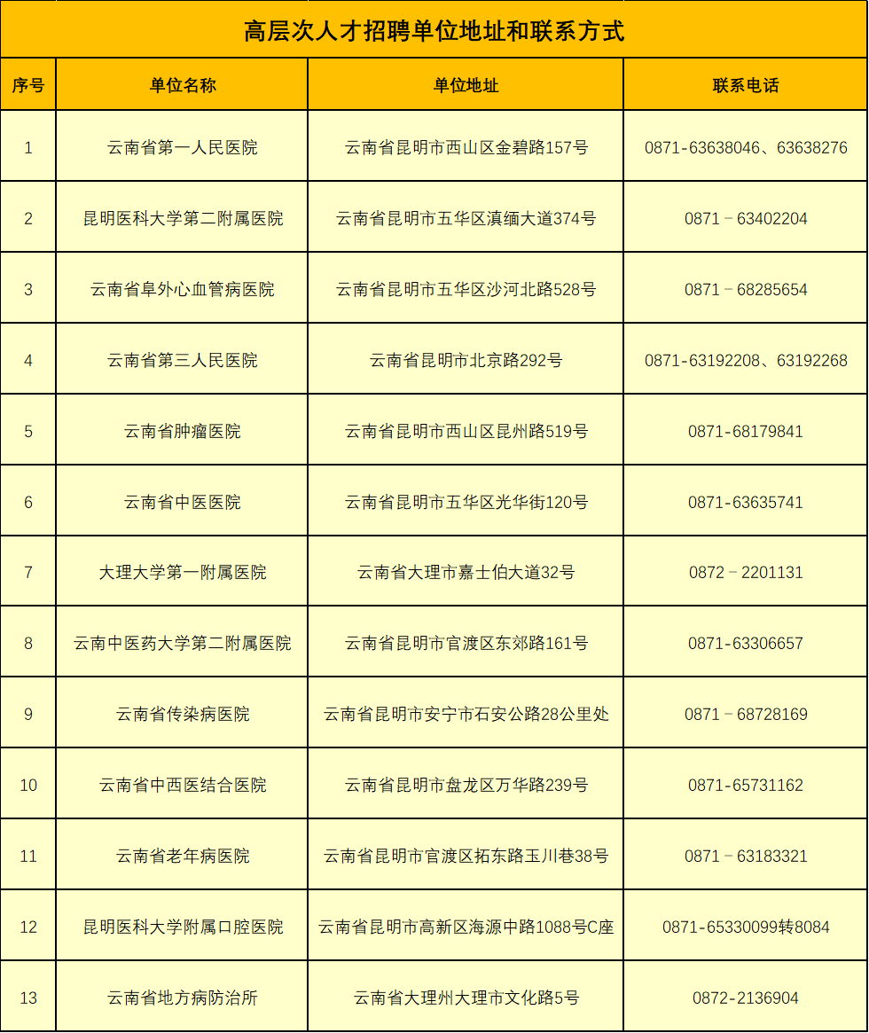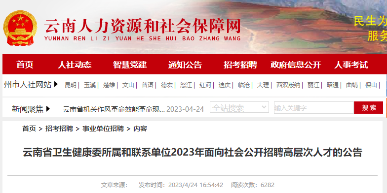 (一)云南省卫生健康委员会所属和联系单位2023年面向社会公开招聘高层次人才的有关信息通过云南人力资源和社会保障网(hrss.yn.gov.cn)、云南省卫生健康委员会网站(ynswsjkw.yn.gov.cn)和云南卫生健康人才网(www.ynwsjkrc.cn)向社会发布。因查看其他渠道的错误信息造成的报考失误,由报考人员自行负责。