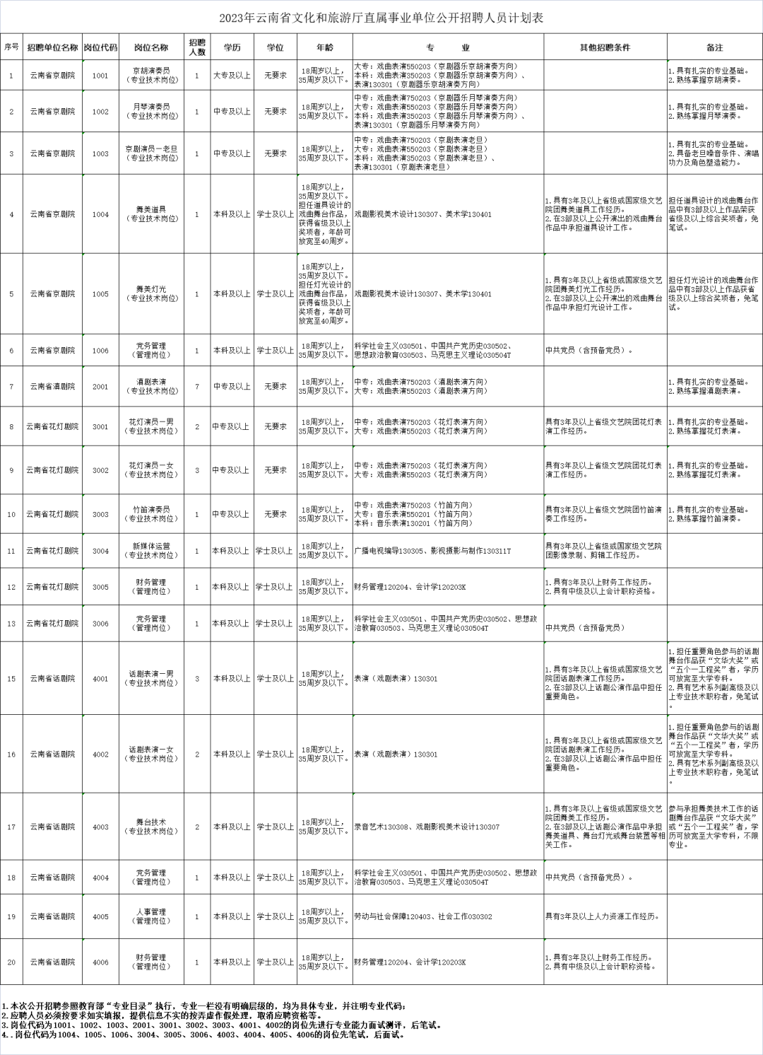 报考岗位代码为1004、1005、4001、4002岗位的应聘人员,符合《2023年云南省文化和旅游厅直属事业单位公开招聘人员计划表》备注中相应条件的,免笔试。