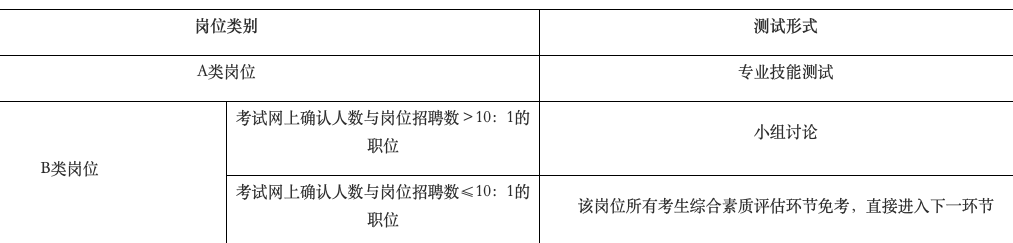 综合素质评估主要采取专业技能测试、小组集体讨论等形式,对考生进行考察。有关岗位分类见附件1需求表,各岗位具体考核形式见下表。