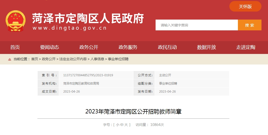 招聘岗位及具体要求,详见《2023年菏泽市定陶区公开招聘教师岗位计划表》(附件1)。