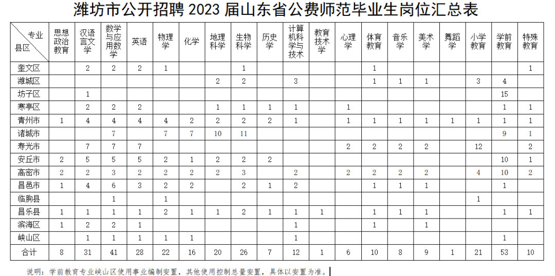 根据山东省师范生公费教育招生计划,定向潍坊的2023届山东省公费师范毕业生公开招聘教师岗位计划330个,具体详见《潍坊市公开招聘2023届山东省公费师范毕业生岗位汇总表》(附件1)。