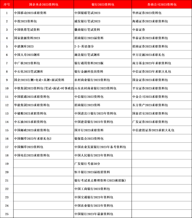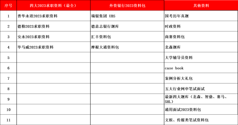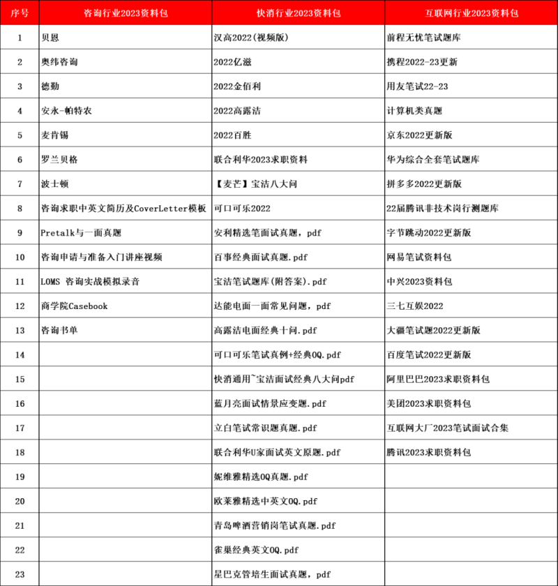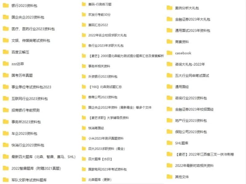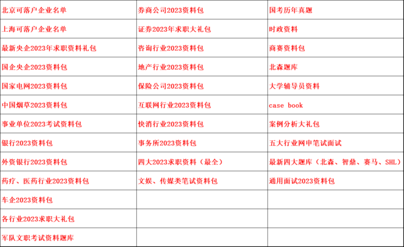 行业:外资投行、券商、事务所、公募基金、银行、互联网、快消、咨询、地产公司、国企央企等等 公司:摩根士丹利、瑞银集团、汇丰银行、德意志银行、易方达基金、汇添富基金、博时基金、华夏基金、央行、国开行、进出口银行、农业发展银行、五大行、建设银行、浦发银行、招商证券、申万宏源、广发证券、方正证券、国泰君安、光大证券、MBB、国家电网、中国石油、腾讯、字节跳动、阿里巴巴、华为、四大、立信、碧桂园、保利地产、恒大、万达、戴德梁行等等 其他:简历大礼包、北京/上海落户名单、各行业薪资表......