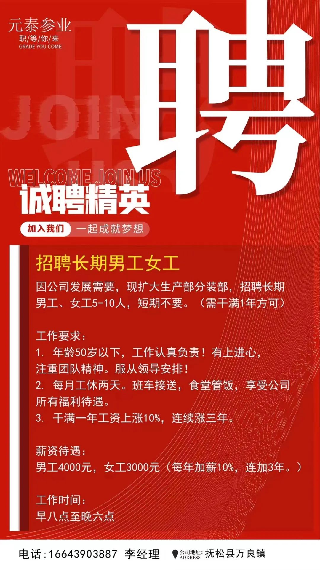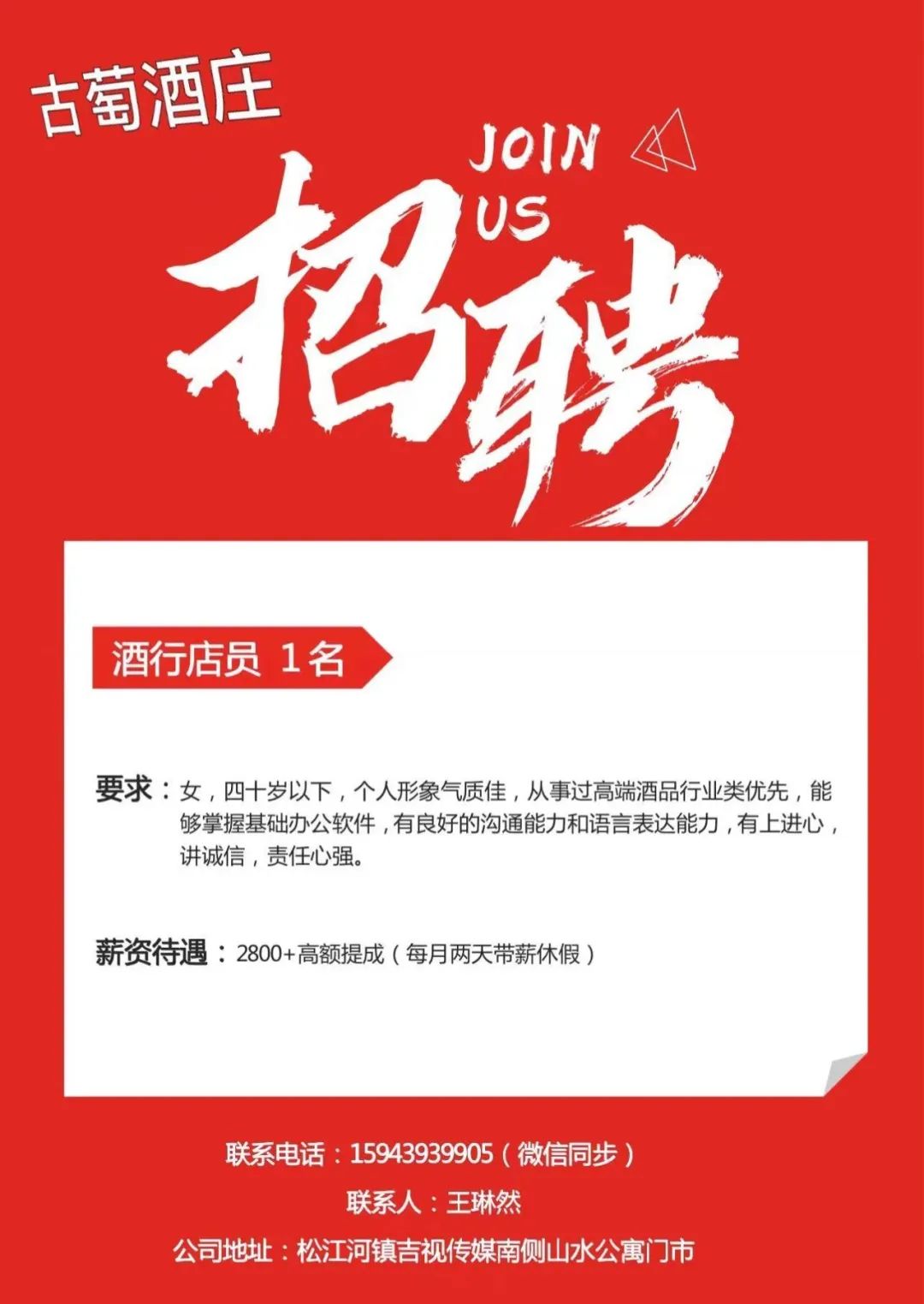 扫码加松江河信息港管理员微信:fs8388fs,便民信息每天会转发到公众号抚松县美团外卖招聘 送餐骑手18-52岁,会骑电动车,会使用智能手机新骑手入职奖励500元+公休两天+车补+工龄奖+满勤奖,简单易学!工作地址:抚松县内/松江河镇内咨询微信/电话:13298819310工作时间:早8:30-晚17:30[庆祝]月休4天岗位职责:商家运营及客情维护,开辟新客户。晋升空间大!工作地点:抚松县内/松江河镇内微信/电话:13298819310招聘美发师,招聘美甲美睫师,头疗师,美容师,美体师,店长,工资底薪3000到5000➕提成➕手工➕奖金➕满勤,干满两年交社保。管吃管住,招收学徒底薪1000,电话15354580999。抚松县宏发汽服诚聘,机修中工2名,机修小工1名,学徒工1名,汽车配件库房管理专员一名,提供食宿,薪金丰厚,待遇最优!合作共赢。工作地点:抚松县抚松镇热线电话:18643956999豆制品加工厂 常年招聘 临时工 力工 零工 日结 150 独立的教室及专业卫生的食堂?为孩子们的健康及营养保驾护航⛵️电话13644494033、13644393188要求:要有爱心、耐心、细心、责任心!有教师资格证者优先!招聘电商客服两名要求:女士,长期工作,会使用电脑,工作细心,善于沟通。年龄25-40岁,有工作经验者优先。不接受短期工,假期工。工作时长7:30-17:30底薪3700元。有季度餐补每月400元,满勤400元。多劳多得,能力出众者有额外奖金。漫江招聘漂流工人3人,手脚灵活,有眼力价,干活儿麻利,有团队精神,有经验者优先电话15943941111.松江河,东方快车饺子馆招聘长期包饺子工,,服务员,学徒工,钟点工,电话15143901768沃尔斯宾馆现招聘前台工作人员2名男女不限有无经验均可,餐厅做早餐的1名,男女不限,薪资待遇优厚有工作经验者优先,客房两名薪资待遇优惠咨询电话☎13604491648 18-35周岁女性,五官端正,性格开朗,善于聊天 就想赚钱 本公司承诺 正规绿色平台 ,请应聘者放心应聘,线上线下均可松城苑西门,党校胡同交接处,老妈饺子馆旁边。每天下午4点现烤特色大油边。小蒜瓣那么一造,小生菜那么一卷,老毕了啊。联系电话15104395600美的公司招聘文员:每月休息2天,工资面议,家电维修师傅、学徒工各两名,带薪培训,一个月即可上门独立工作,带车上门服务,工资4000~6000公司位置:松江河镇林区医院南侧 工作时间:8:00上班 5.30下班,薪资待遇面谈 详情请咨询13944201692,6215899本公司系人参工厂,因公司发展需要,现扩大生产部分装部,招聘长期男工??女工?♀️?5-10人,短期不要。(需干满1年方可)1. 年龄50岁以下,工作认真负责!有上进心,注重团队精神。服从领导安排!2. 每月工休两天。班车接送,食堂管饭,享受公司所有福利待遇。薪资待遇:男工4000元,女工3000元(每年加薪10%,连加3年。)工资:保底3500+养老保险➕月休息3天➕日奖励➕月奖励年龄55岁以下,女性。需要有爱心,耐心,责任心!工作时间早8点-下午4.30,每月休息4天。工资:底薪+提成,上不封顶。老板人帅事少钱多,欢迎你的加入!工资底薪2700加千分之五提成 ➕达到销售额还有奖金 +工龄奖 ➕ 每个月带薪休假一天 不休息奖金200 每周倒班一次 每个月带薪休假一天 不休息给奖金 工资多 待遇好 累计工作时长每小时20元+工龄奖金,多劳多得,每月休息四/五天,法定节假日休息。还有不定期团建和福利要求:女,四十岁以下,从事过高端酒品行业类优先,能够掌握基础办公软件,有良好的沟通能力和语言表达力,有上进心,讲诚信,责任心强。招聘…彩钢瓦安装团队,招聘彩钢瓦安装工人!要求有工作经验,年轻48岁以上,欢迎有兴趣的朋友咨询,电话18743977851招聘万良市场摆摊卖货老板,薪资5000起,要求有工作态度,口齿伶俐,会卖货,爱唠嗑,善于沟通,敢于表达,思想跳跃性强,有底蕴者优先。长期聘用,年龄不限,男女不限,急聘电话:13159794666现需 白钢铁艺大工,氩弧焊工,电焊工,断桥铝制作安装工,为人踏实肯干,不怕吃苦,45岁以下,会开车者优先,薪资面议,电话:15043984777抖音女主播:无责任保底工资5000元,提成60%-80%全县最高,均收入10000-30000元,要求颜值,才艺,良好沟通能力。年龄18-35周岁。(工资可日结)招聘人事专员:永久性提成,工作时间自由,男女不限,有良好的社交能里,沟通能力强,抚松县本地人,平均工资10000左右。每天工作5小时,包吃包住,下班县内公司车送待遇优厚,可到店工作可居家工作,如有意向欢迎致电,工作地点:抚松县内,联系电话:13039071234 大车,C1,C2全程VIP班,大量收人,无任何考试压力,无任何额外收费。招聘:长白山飞机场餐厅招聘,主管1人,收银员3人(年龄40岁以下),服务员3人(年龄50以下),要求形象良好 ,普通话流利。有相关工作经验者优先,包吃包住;短期勿扰,工资面议,招聘电话:19003095993松江河品牌男装店高薪诚聘导购一名 月工资4000左右(底薪+满勤+奖金+保底)+提成保底工资(满勤+)=3000年龄30—50之间要求能长期工作的电话 15844946887.15844954877地址镇医院楼下门市
