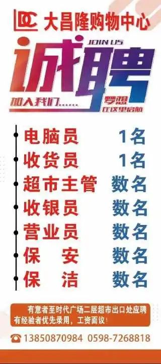 职位描述:有意者至时代广场二层超市出口处应聘,有经验者优先录用,工资面议 13850870984 0598-7268818