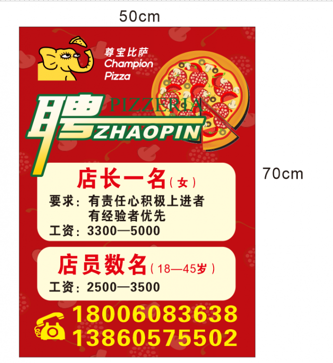 职位描述:大田【尊宝比萨】招聘啦! 店长一名(女) 要求:有责任心积极上进者 有经验者优先工资:3300-5000 店员数名(18-45岁) 工资:2600--3500 电话18006083638 ~13860575502