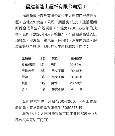 职位描述:普工 5名 男女不限 20-50岁 无纺布 6名 男性 18-50岁 干法收卷 2名 男女不限 20-45岁 公司包吃包住,月薪4200-7000元,有工作经验者优先,有意者速联系张先生15080577119 地址:大田县华兴镇京口工业区509号(3路公交车直达门口)