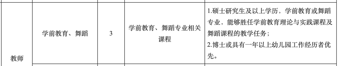 1.硕士研究生及以上学历、学前教育或舞蹈专业,能够胜任学前教育理论与实践课程及舞蹈课程的教学任务;