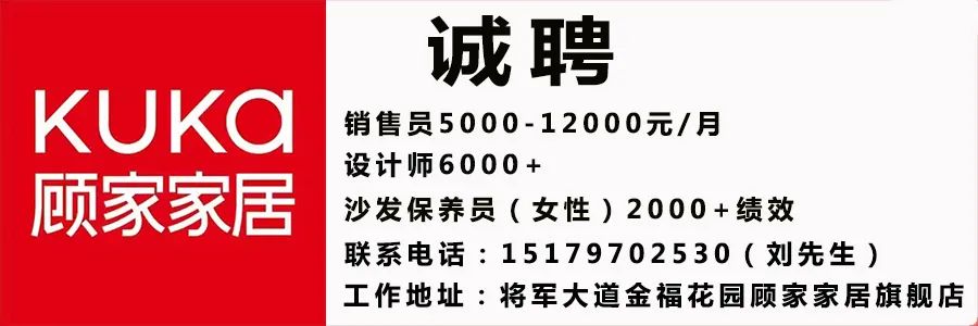 优库家居诚聘家居销售:5名薪资:保底4000+提成+奖励提成要求:1、年龄18至45周岁,高中以上学历;2、热爱销售工作,有无经验皆可,有家具建材销售经验优先;3、具备良好的沟通能力与抗压能力,有责任心,有进取心;日常工作:1、负责客户接待及咨询,了解客户需求;2、主动邀约客户并介绍店面(促销)活动和新产品介绍;3、协助整理店内货品陈设,保持整齐、美观;4、配合开展各类营销活动落地执行,完成领导交办的其他工作内容。福利待遇:1、月休假+年假+法定假;2、广阔的培训晋升空间;3.免费旅游+团建招聘热线:18296771717(李先生)面试地址:城西街润兰家居(老城西车站对面)