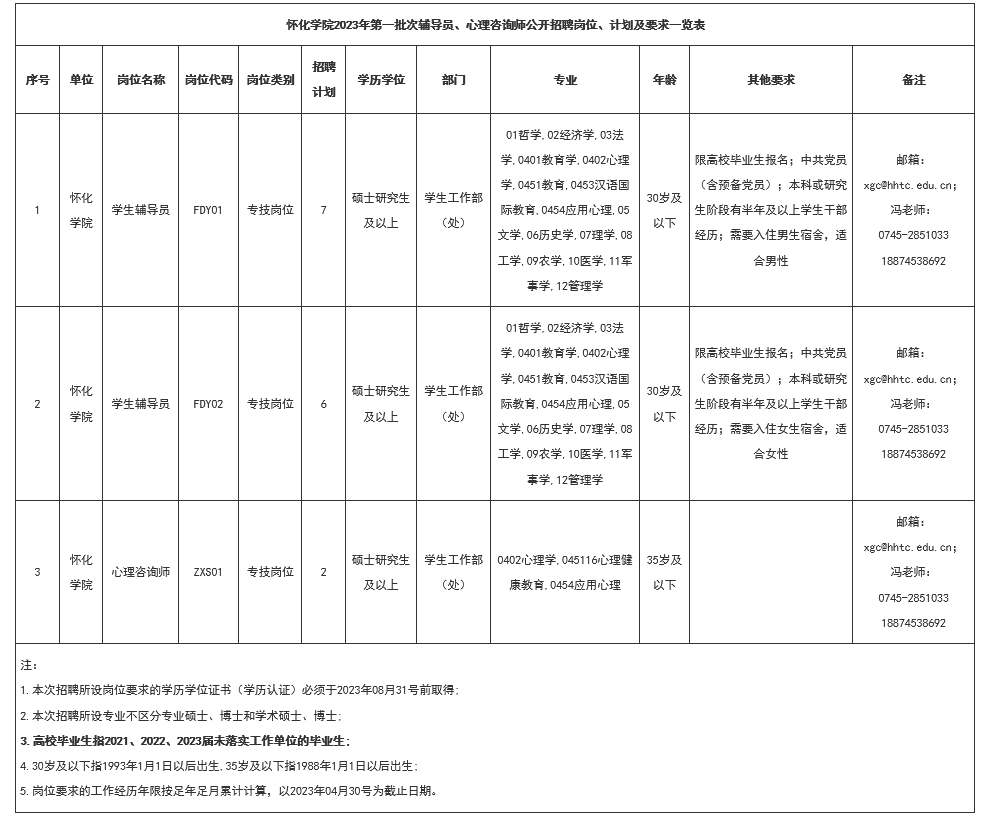 附件1:怀化学院2023年第一批次辅导员、心理咨询师公开招聘岗位、计划及要求一览表(附后)